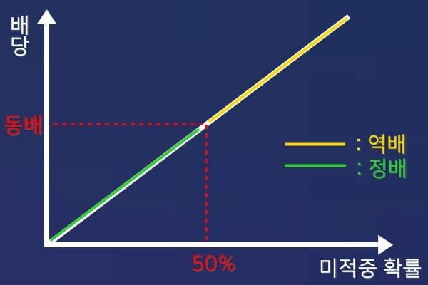 역배의 경우 하이리스크 하이리턴의 개념이고 정배의 경우 로우리스크 로우리턴의 개념일뿐 환급률은 모두 같죠. [관련 링크: 정배와 역배 어떤 배팅이 더 효율적일까?]